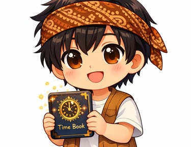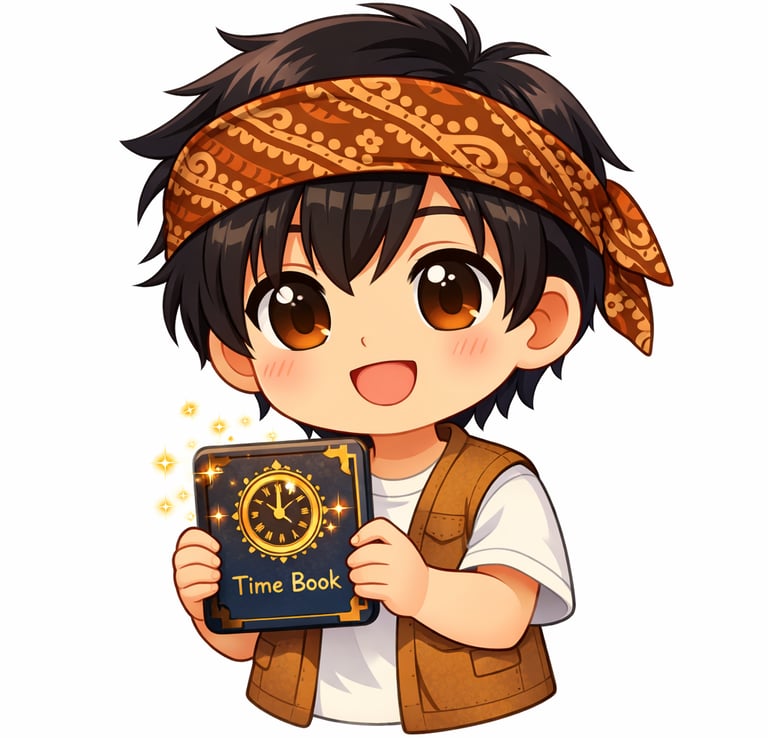A clever boy with a batik headband and the mysterious Time Book. He unlocks secrets of the past.