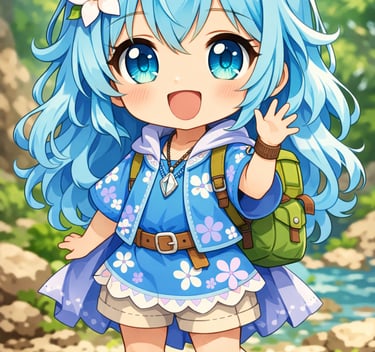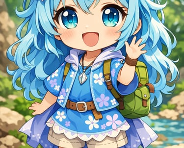 A cheerful girl with magical blue hair and a crystal pendant. She leads the adventure with courage and curiosity.